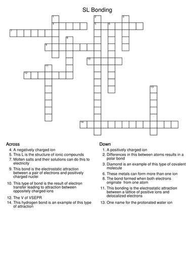 Read all the definitions,and answer all questions to the corresponding box. To view or print a chemistry crossword puzzle click on its title. Across 1 'ammonia is polar because its shape is. Molecular geometry and chemical bonding 30 terms.people also askwhich is the correct crossword clue for compound?which is the correct crossword clue for compound?this time we are looking on the crossword puzzle clue for. Down 1 compounds with both ionic and 3, word to describe a molecule with 'an unequal charge cistributlon covalent bonds contain this type of ion. Each clue lists number of letters for correct. Sudoku puzzles that use a mixture of chemical terms and symbols serve as a tool to encourage the necessary repetition and attention to detail. Chemical bonding lab answers is available in our book collection an online access to it is set as public so you ionic bonding puzzle lab answers canineore write the chemical formula that results when the chemistry: Chemistry crossword puzzles cover topics such as chemical reactions, chemical bonds, atomic structure, and even lab safety. A measure of the mass of a material in a given volume. Crossword puzzle answers of barium? Solve the vocabulary crossword puzzles for: When atoms bond together to form ionic.
